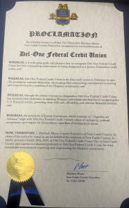 New Castle County Executive Matt Meyer, who also attended the ceremony, stated this designation “goes to the heart of who we are, as Americans and Delawarians”.  He also presented a proclamation to Del-One which includes, “the principles of Juntos Avanzamos, which translates to ‘Together we Advance’, align with Del-One Federal Credit Union’s values of inclusivity, cultural competence, and respect for all members, regardless of immigration status.”  Mr. Meyer then proclaimed March 28, 2024 as Del-One Federal Credit Union Day in New Castle County, and expressed gratitude for Del-One’s “remarkable commitment to serving and empowering the Hispanic community.”